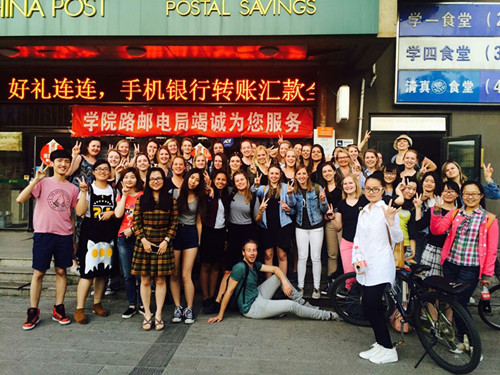 在小组讨论之后,奈梅亨大学员工在我校员工的组织带领之下游览了校园风光并一同到合一食堂2层就餐,我校同学热情的为外国友人推荐特色中式食物,并教她们使用筷子,用餐气氛和谐、融洽,最后一同合影留念。