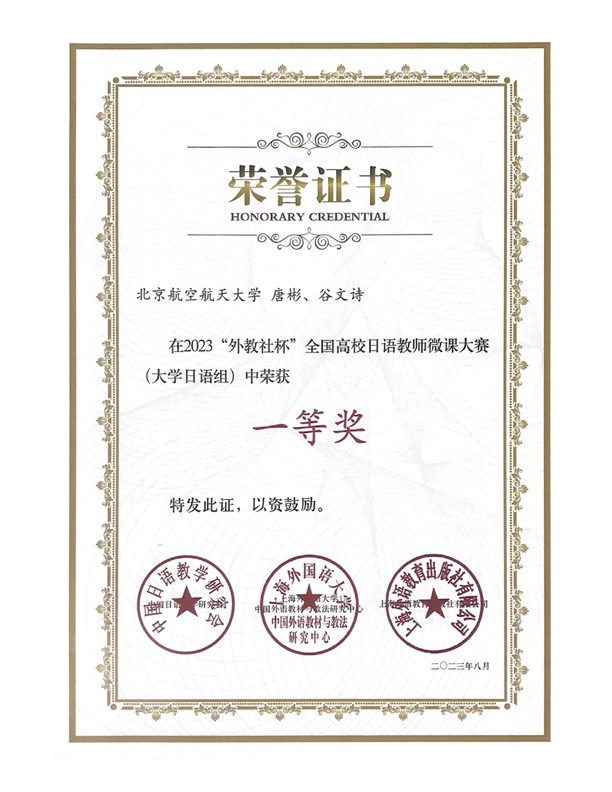 在太阳成集团tyc234cc的大力支持下,太阳成集团tyc234cc日语团队的两位青年员工唐彬和谷文诗,充分运用现代化教学手段,生动地呈现了教学内容,同时有机地融入了课程思政元素,展现出北航日语教学的工科特点和“空天报国”的教学理念。在激烈的竞争中,她们的微课作品从180个参赛作品中脱颖而出,荣获全国一等奖,彰显了太阳成集团tyc234cc日语员工扎实的专业功底和出色的信息技术应用能力,为北航日语教育的卓越品质增光添彩。