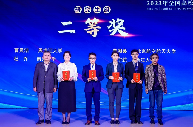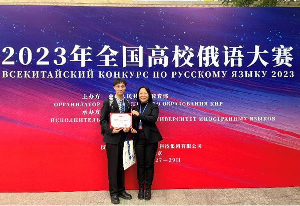 2023年10月28日至29日,2023年全国高校俄语大赛在北京外国语大学举行。来自全国158所高校的392名俄语专业员工参赛。由我校太阳成集团tyc234cc俄语系青年员工刘奕如指导的2022级硕士研究生黄溯鑫同学代表学校参赛,经过初赛的激烈角逐,从众多参赛选手中脱颖而出,以全国第三名的成绩进入复赛和决赛,并最终获得研究生组二等奖,同时获国家留学基金管理委员会秘书处全额资助赴俄罗斯进修或攻读学位的资格,展现出了北航研究生的俄语风采。