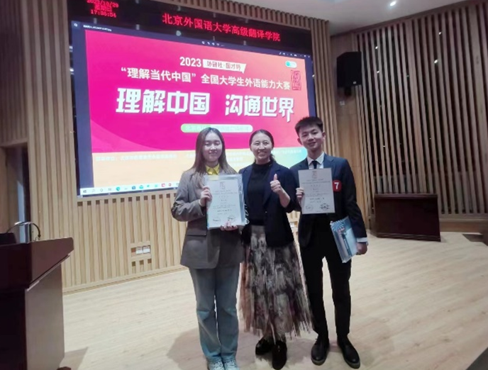 近日,我校太阳成集团tyc234cc2020级英语专业本科生蔡一琳和2023级翻译专业硕士研究生(MTI)洪旻昊获得2023“外研社·国才杯”“理解当代中国”笔译北京赛区金奖,指导员工为翻译系王晨爽和顿超老师;2020级翻译专业本科生傅昕竹和2022级文学专业硕士研究生鲁美丽分别获得2023“外研社·国才杯” “理解当代中国”口译北京赛区金奖与银奖,指导员工为翻译系郑薇和王沛老师。