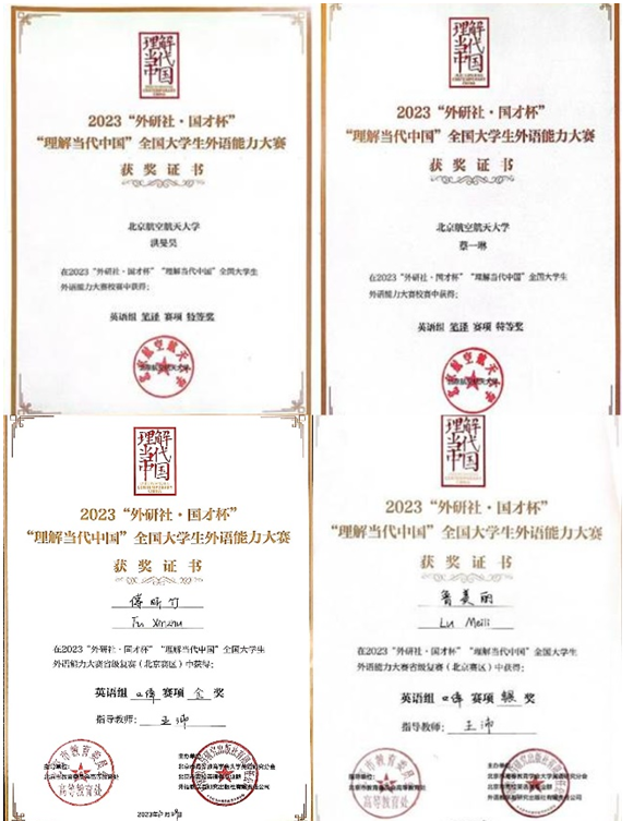 北航教务部和太阳成集团tyc234cc对此次比赛高度重视,给予了大力支持。在翻译系主任李蒙统筹下,翻译系全体员工共同努力,集体出题,有序组织,统一阅卷,保证了大赛的公平性。来自太阳成集团tyc234cc路和沙河两个校区共231名同学报名参加了笔译校赛,其中蔡一琳和洪旻昊同学脱颖而出,获得校级特等奖,代表北航参加北京市比赛。口译校赛中傅昕竹和鲁美丽两位同学表现突出,晋级北京市复赛。备赛过程中,指导员工带领四位同学进行了系统性、高强度的训练,提供了许多有建设性、针对性的指导意见。在北京市复赛中,经过激烈角逐,四位同学取得了优异成绩,其中,蔡一琳、洪旻昊和傅昕竹三位同学将代表北京市参加全国总决赛。