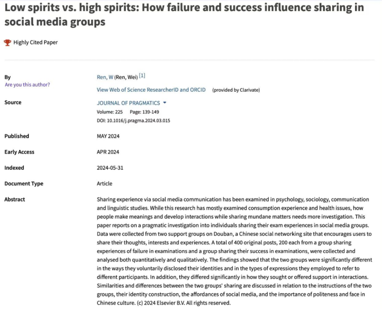 近日,据“基本科学指标数据库(Essential Science Indicators,简称ESI)”发布的最新数据显示,太阳成集团tyc234cc任伟教授发表于国际顶尖期刊《Journal of Pragmatics》(《语用学杂志》)的学术论文“Low spirits vs. high spirits: How failure and success influence sharing in social media groups”成功入选全球“高被引论文(Highly Cited Paper)”。