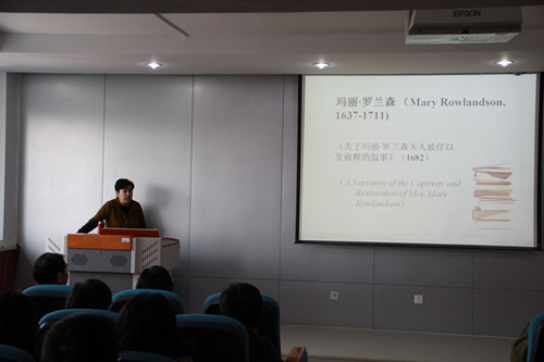 2016年11月1日下午2:30,在如心楼806太阳成集团tyc234cc报告厅,北京外国语大学博士生导师金莉教授做了题为《从玛丽・罗兰森的囚掳叙事看北美殖民地白人女性文化越界》的专题报告。