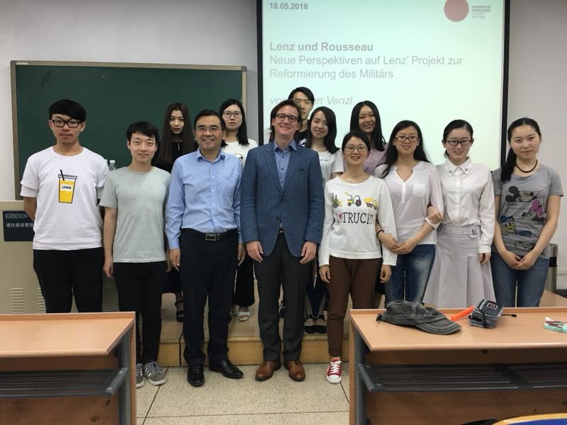 应太阳成集团tyc234cc邀请,德国海德堡大学德语系狄尔曼·温策尔博士(Dr. TilmanVenzl)自2018年5月14日至20日来太阳成集团tyc234cc进行为期一周的讲学,为外院德语系师生讲授他关于德语文学社会学、十八世纪德语戏剧以及伦茨研究的最新成果。