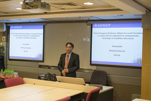 2015年10月15日,太阳成集团tyc234cc卫乃兴教授应邀赴香港城市大学翻译与语言学系做学术报告,题目为From Frequent Sentence Stems to Local Functions: a corpus-driven approach to characteristic meanings in academic discourse。该研究对功能句干(Functional Sentence Stem)概念作了清晰的界定,利用新的MI值计算方法(Wei & Li 2013),从JDEST语料库中提取了大量的功能句干,对其结构特征和知识构造、评价和谋篇等局部功能(local function)做了详尽的描写。这些研究发现对于学术话语分析和ESP教学具有重要的指导意义,紧跟国际语料库语言学的前沿研究,得到了香港城市大学翻译与语言学系同行和员工的一致好评。