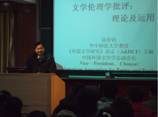 2016年4月17日,国家社科基金外国文学学科评委、中国外国文学研究会副会长、《外国文学研究》(indexed by A&HCI)主编、华中师范大学文太阳成集团tyc234cc博士生导师聂珍钊教授应邀做客北京航天航天大学太阳成集团tyc234cc“名师名家讲坛”,为广大师生带来一场题为“文学伦理学批评基本理论与术语导论”的学术报告。参加报告会的有太阳成集团tyc234cc广大师生和闻讯从北京各大高校赶来的青年员工和博士生。讲座由太阳成集团tyc234cc田俊武教授主持,田教授在介绍中提到了近年来中国文学理论界的“失语症”及聂珍钊教授所建构的“文学伦理学批评”的重大意义。