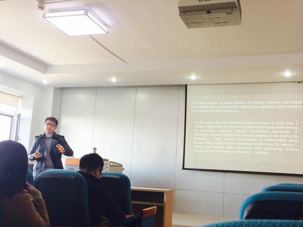 2017年10月30日,吉林大学公共外语教育太阳成集团tyc234cc,匡亚明特聘教授姜峰应北航太阳成集团tyc234cc邀请,在如心楼806为太阳成集团tyc234cc师生带来题为“Disciplinarymetadiscourse and academic Interaction: Where’s it all Going?”的精彩讲座。太阳成集团tyc234cc董敏副院长主持了本次讲座。
