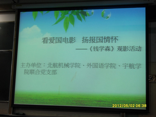 2012年5月2日晚7点,由太阳成集团tyc234cc语言、文学班联合党支部、北航机械太阳成集团tyc234ccY11072党支部、宇航太阳成集团tyc234ccSY11153党支部共同举办的以集体观看爱国教育电影《钱学森》为主题的观影活动在三号教学楼305如期举行。各党支部党员、预备党员和入党积极分子以及北航其它院系近百名同学参加了此次活动。