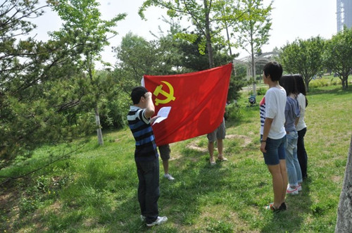 这天阳光明媚,微风习习,奥体森林公园层峦叠翠,水波粼粼。同学们踏着浓浓的春意来到奥林匹克森林公园。首先进行的4名积极分子于琰、宋应娇、李双、蔡宸美同志的的入党仪式。背靠着青山绿水,在所有党支部成员见证下,四名同志郑重地宣读入党申请书,并深情回顾了她们的成长历程,讲述党的光芒是如何在孩提时代洒向了心间、播下了种子,讲述了这信念之花是如何在自己成长历程中破土而出,生根发芽。正值开花之际,映着蓝天碧草,党员们分别投下庄重的一票。面对庄严的党旗,他们激情嘹亮地宣誓,用心和行动成为一位名副其实的中共预备党员。同时,其余入党积极分子表示以党员为目标,向他们学习,努力提高自己,不断完善自己,争取早日加入中国共产党这个大家庭。