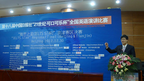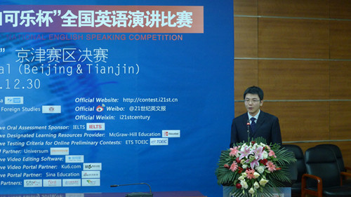 “21世纪杯”全国英语演讲比赛自1996年创办以来,已成为中国外语界最为权威的英语演讲比赛。它同时被指定为每年在英国伦敦举办的国际英语演讲比赛的中国区选拔赛,充分显示了大赛高层次的学术地位。本届大赛在互联网海选、校园选拔赛、地区决赛期间的演讲主题是My view on social networking,吸引了来自全国各地高校的上万名选手报名参赛。经选拔,全国17个赛区共有约400名优秀选手脱颖而出,代表其所在学校参加地区决赛。京津地区决赛为重中之重,云集了来自北京和天津地区的优秀选手,竞争十分激励。选手们从上午9点正式开始比赛,直到下午5点。比赛内容包括定题演讲、即兴演讲和现场问答三个环节,要求员工不仅要有优秀的演讲水平,还要有灵活的应变能力。